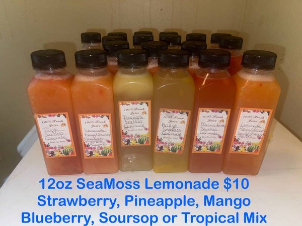 Seamoss lemonade is a combination of classic lemonade and sea moss. It is made with natural fruits such as lemons, mango, blueberries, strawberries, pineapple, and soursop. With your choice of monk fruit agave or honey for sweetener.